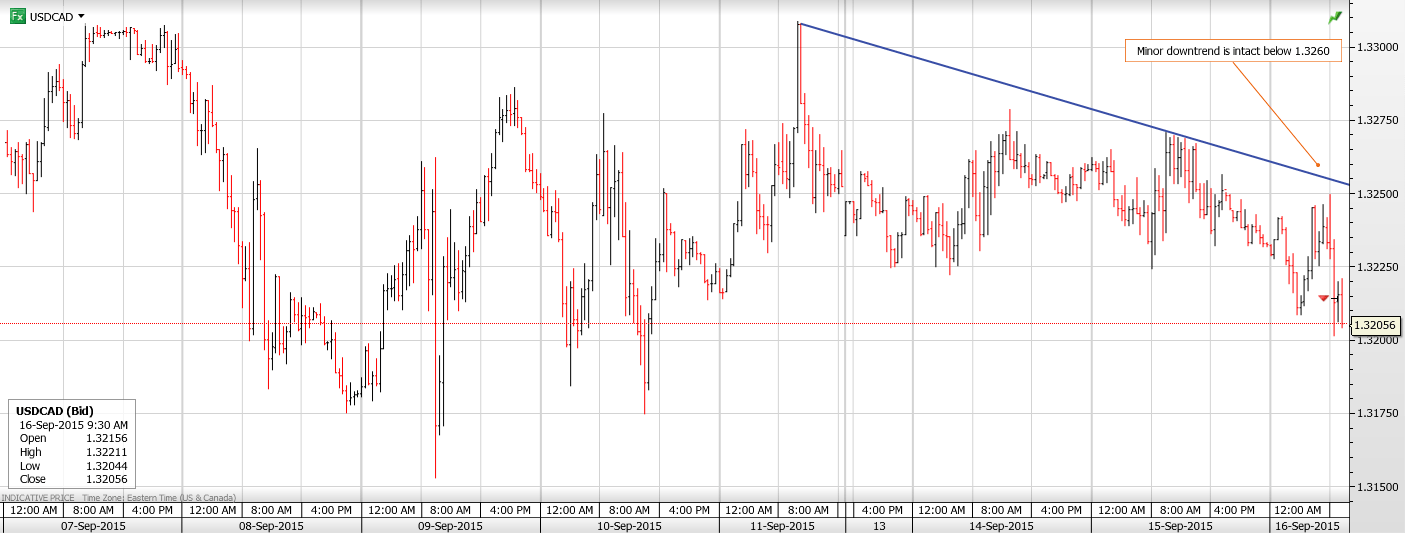 USDCAD is in a minor downtrend while trading below 1.3260 but needs to break support at 1.3180 to avoid additional 1.3180-1.3280 consolidation. A break either side of the range will garner an additional .0100 points.