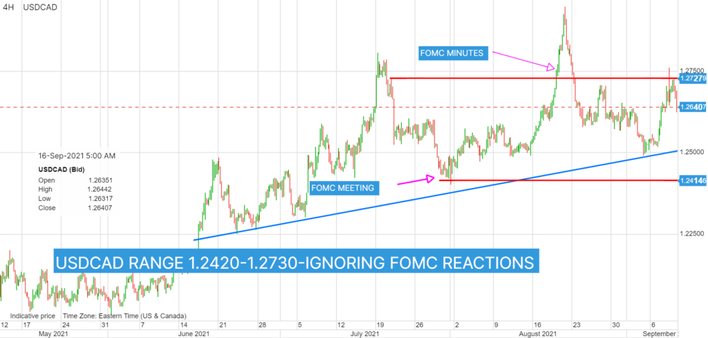 USDCAD is consolidating yesterday’s losses, albeit with a modestly bullish bias. USDCAD dropped from 1.2693 just before Canada CPI on Wednesday to close at 1.2625. Statistics Canada noted “Consumer Price Index (CPI) rose 4.1% on a year-over-year basis in August, the fastest pace since March 2003, up from a 3.7% gain in July. The increase in prices mainly stems from an accumulation of recent price pressures and from lower price levels in 2020.”  Analysts are beginning to believe that inflation may be less transitory than what the Bank of Canada believes.