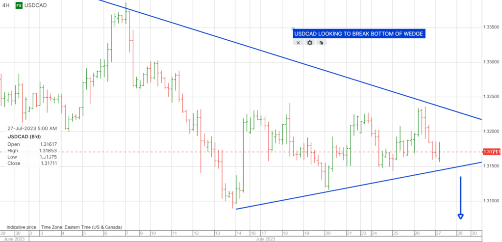 USDCAD is trading with a negative bias following speculation that yesterday’s 25 basis points (bp) Fed rate increase is the last hike for this cycle. The selling pressure was reinforced when the Bank of Canada released its Summary of Deliberations (minutes) from the July 12 meeting. They didn’t offer up anything new but served to put traders on notice that Canadian rates can still rise further.