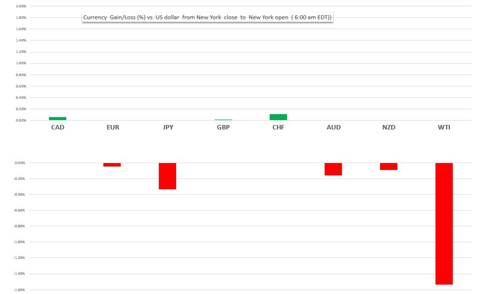 Change in currency value against the US dollar from NY close to NY open (6:00 am EST)