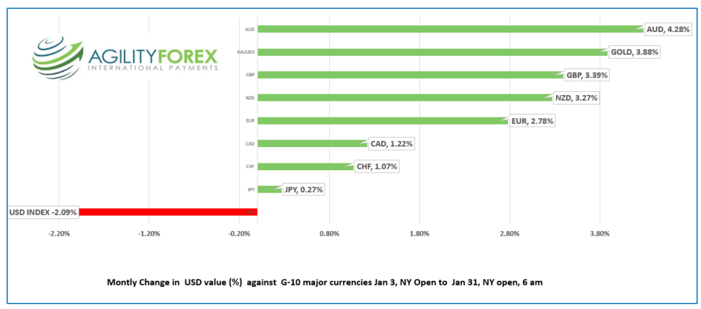 The US dollar opened with gains across the board compared to Monday’s close, but the rally is mostly due to profit-taking and position adjustment ahead of Wednesday’s FOMC decision. However, it’s a different story for the greenback since the start of the year. China’s sudden reversal from covid-zero policies to reopening the economy to the world with open arms, powered the Australian dollar to a 4.28% gain in January, making it the best performing currency.  The Japanese yen was the laggard after government and BoJ officials leaned against monetary policy tightening euphoria.