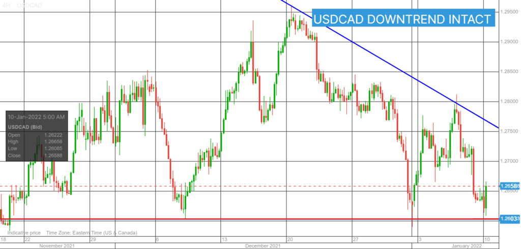 Technical view: The intraday USDCAD technicals are bullish following the test and rebound off of the 1.2600-1.2610 support area and the subsequent breach of the minor January downtrend line when prices moved above 1.2650. Nevertheless, the downtrend line from December 20 remains intact below 1.2770 and unless it is decisively broken, further tests of support are likely.