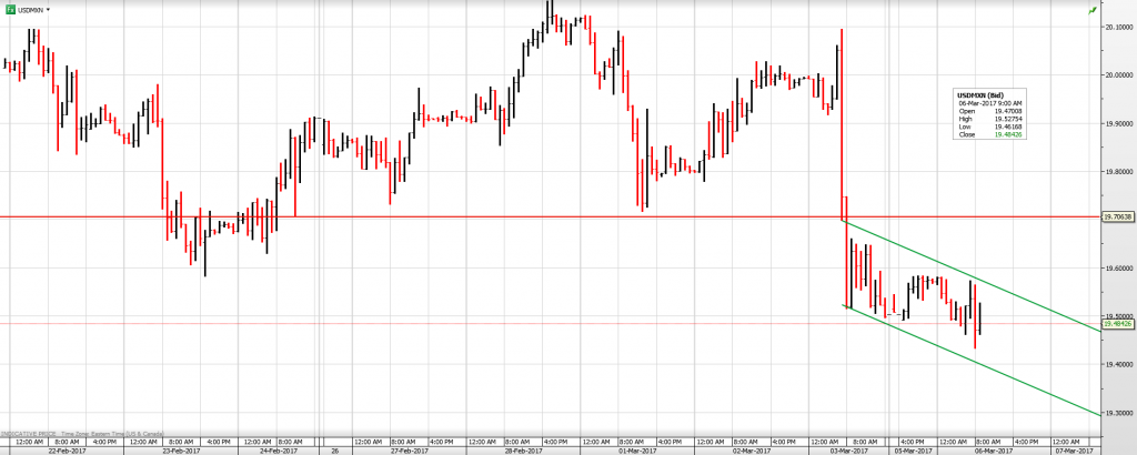 The intraday USDMXN technicals are bearish and in a descending downtrend channel bound by 19.5900 on the top and 19.3870 on the bottom. A top-side break will extend gains to 19.7000 while a downside break will lead to 19.2000