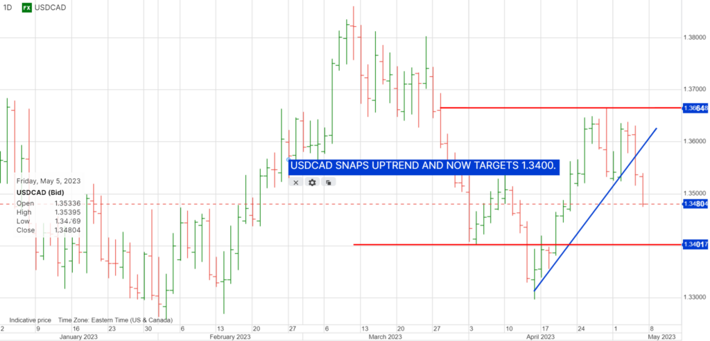 USDCAD sank due to broad US dollar weakness after monetary policy divergence between the ECB and the Fed sparked a sharp US dollar retreat. The move was exacerbated by escalating fears that the US banking crisis was not over, despite what JPMorgan Chase President Jamie Dimon saying it was.