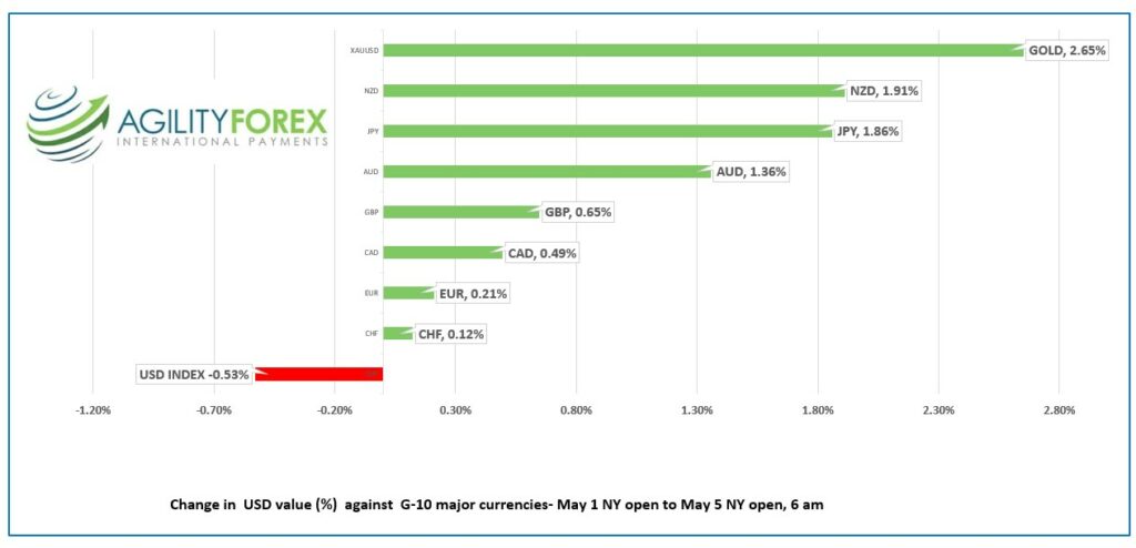 The US nonfarm payrolls surprised to the upside by adding 253,000 jobs (forecast 179,00), the unemployment rate dipped to 3.4% from 33.5% and average hourly wages rose 0.5% m/m compared to 0.3% in March.