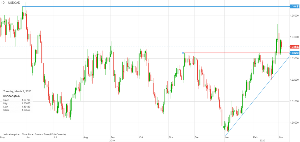 Arguably, the domestic economy has suffered far more than its neighbour to the south. Railway, blockades, fleeing energy investment, and coronavirus, suggest weaker-than-expected Q1 GDP growth which suggests a 0.50% rate cut is in the cards. If so, USDCAD will retest 1.3450.