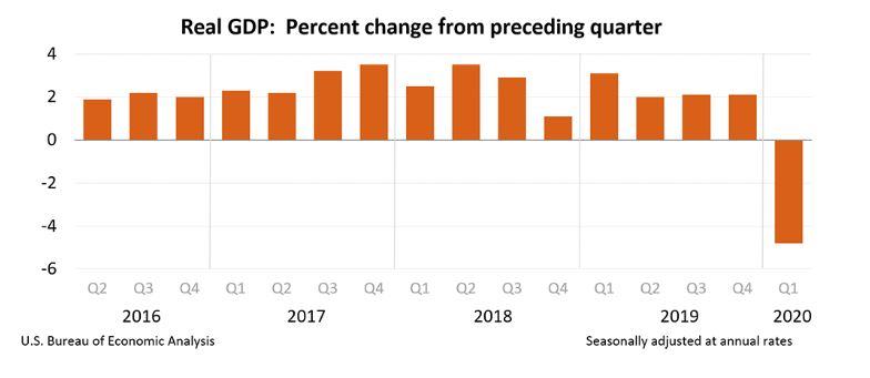 FX Recap and outlook: US Q1 2020 GDP was a tad weaker than expected, falling 4.4% compared to forecasts for a 4.0% decline. The US Bureau of Economic Analysis said “he decrease in real GDP in the first quarter reflected negative contributions from personal consumption expenditures (PCE), nonresidential fixed investment, exports, and private inventory investment that were partly offset by positive contributions from residential fixed investment, federal government spending, and state and local government spending.