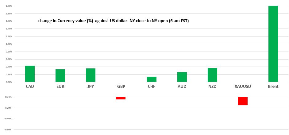 WTI oil prices jumped to $14.70/barrel from $12.34/b at yesterday’s close, bringing its 24 hour gain to 46%. The move comes on the heels of an ever-so-slightly better API crude inventories report. Weekly crude inventories rose 10 million barrels rather than the 10.5 million barrels expected. Price support stems from profit-taking after the decline since Monday and ahead of the onset of Opec production cuts which start on Friday.