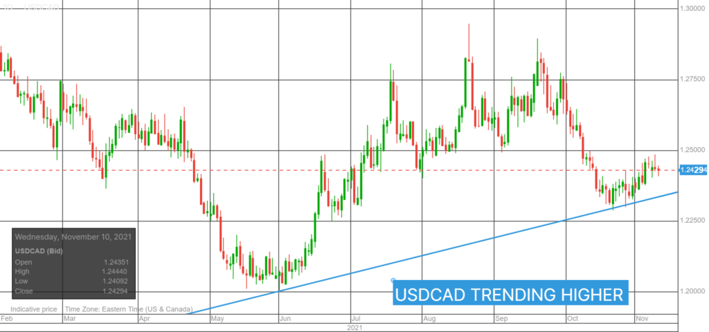 USDCAD climbed to 1.2482 yesterday, coinciding with the option expiry window, then slid lower and closed nearly unchanged from Monday. Prices were steady in Asia then dropped to 1.2413 when Europe opened. USDCAD is on the defensive supported by WTI oil prices climbing to $84.92/b. API reported a 2.485 million barrel draw down in US crude inventories as of November 8 and traders are hoping today’s EIA report is similar. WTI is trading at $83.72 in NY.