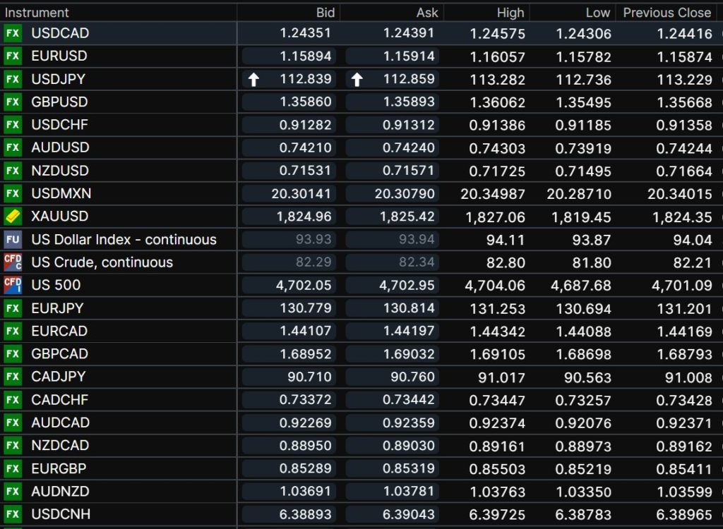 FX open, high, low, previous close