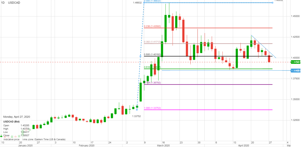 The intraday USDCAD technicals are bearish below 1.4030 looking for a break below 1.3930 to target the 61.8% Fibonacci retracement level of the March range, which is 1.3870. For today, USDCAD support is at 1.3930 and 1.3870. Resistance is at 1.3990 and 1.4040. Today’s Range 1.3910-1.4010