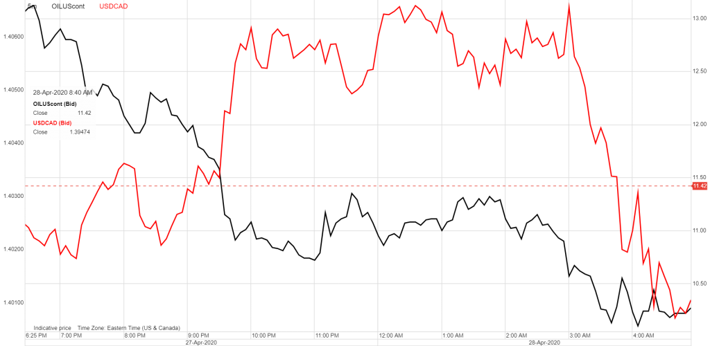 The following charts shows the tight correlation between USDCAD and WTI price movements overnight.