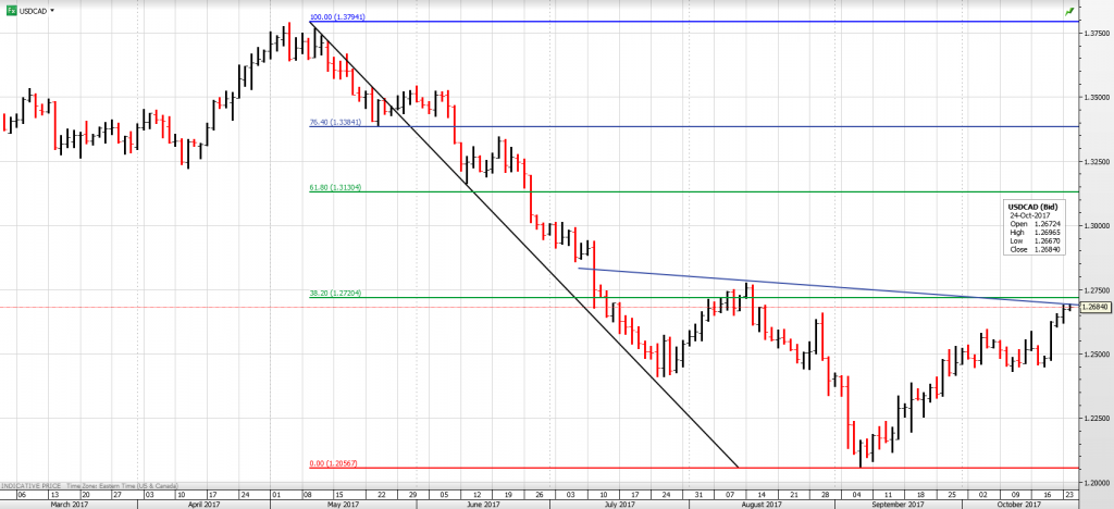 USDCAD cracked above 1.2700  in early New York trading, reaching 1.2720 before retreating to  1.2695 ahead of US data releases.   September Durable Goods rose 2.2% compared to  August’s 2.0% gain, ex-transportation was unchanged at 0.7%.