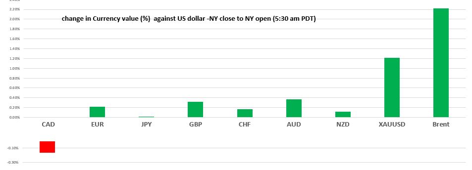 Chart: Currency gain/loss (%) against the US dollar from NY close to 5:30 am PDT)