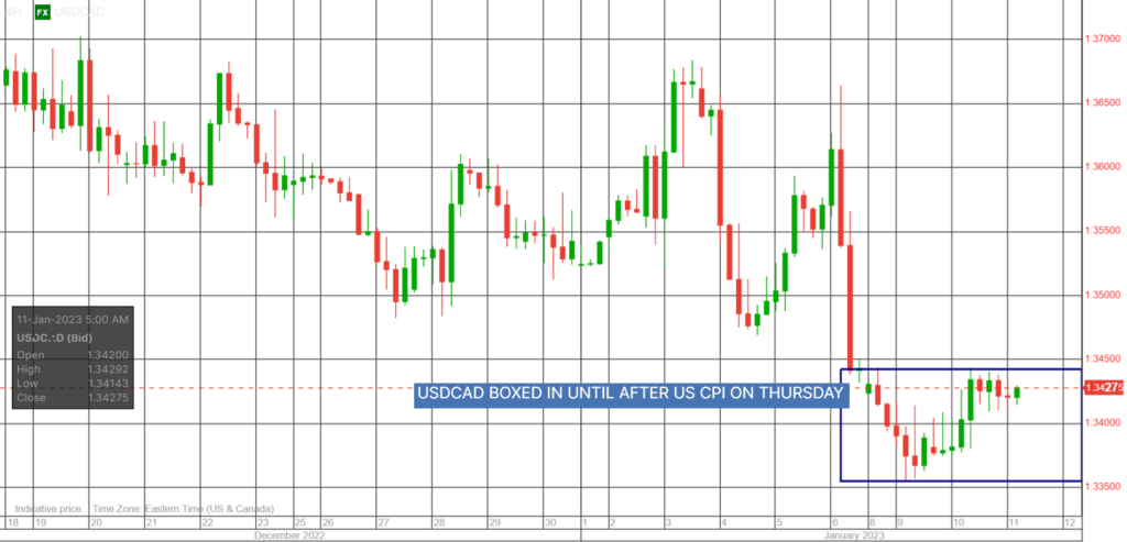 USDCAD is not getting much support from WTI oil prices, which have fallen from $81.45 at the beginning of the year to $75.37/b today. Traders are hoping that Russian sanctions, China’s reopening, and Opec production cuts would fuel a rally towards $100.00/b.  However, concern around Thursday’s US CPI data and the American Petroleum Institute reporting crude inventories rose 14.9 million barrels last week, has limited gains.