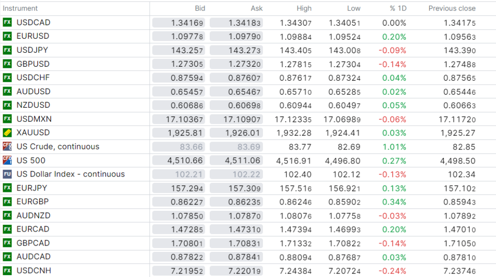 FX high, low, previous close-Monday