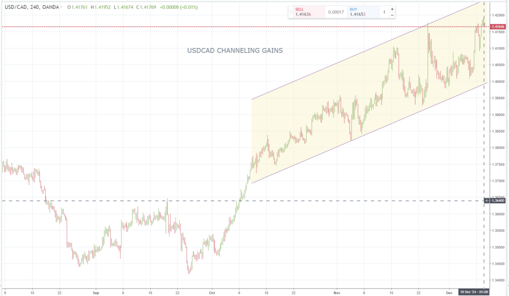 The uptrend channel from the beginning of December is intact while prices are above 1.4050 with the top of the band in the 1.4250 area.