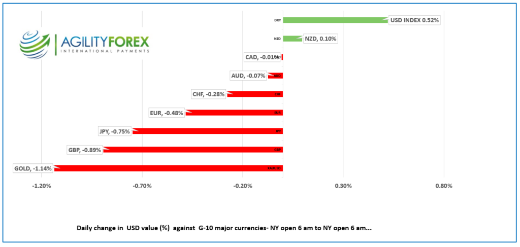- US dollar gains on profit-taking and Fed comments.