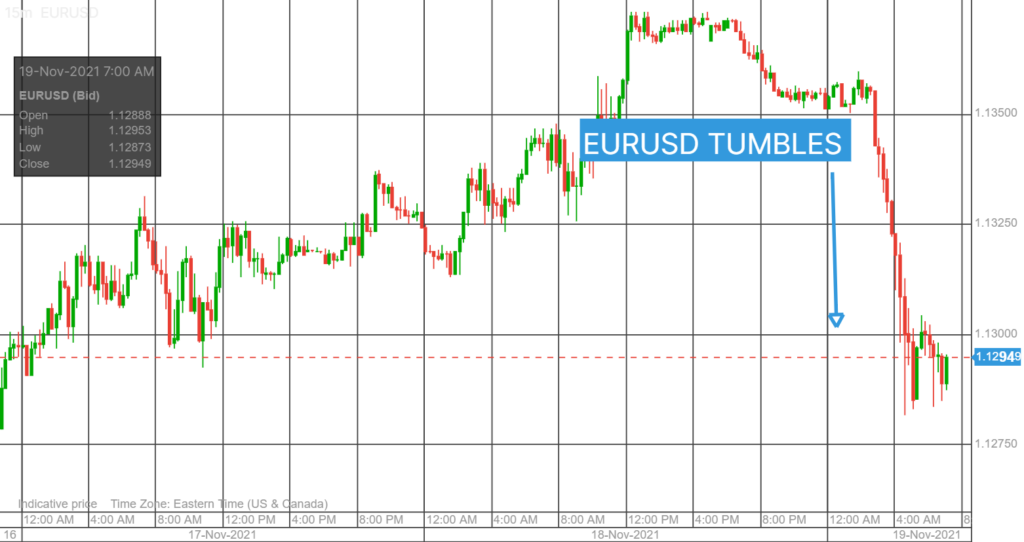 EURUSD inched lower in Asia, falling from 1.1372 to 1.1350 just before Europe opened. Then the bottom fell out, and EURUSD plunged to 1.1283.  Coronavirus fears and more dovish comments from ECB President Christine Lagarde weighed on the currency. Ms Lagarde repeated concerns about “premature tightening” and that inflation wiould retreat from current levels. Traders ignored news that the Eurozone posted a trade surplus of €19 billion in September, and German PPI rose 3.8% m/m in October. EURUSD will test 1.1170 on a break of 1.1260.