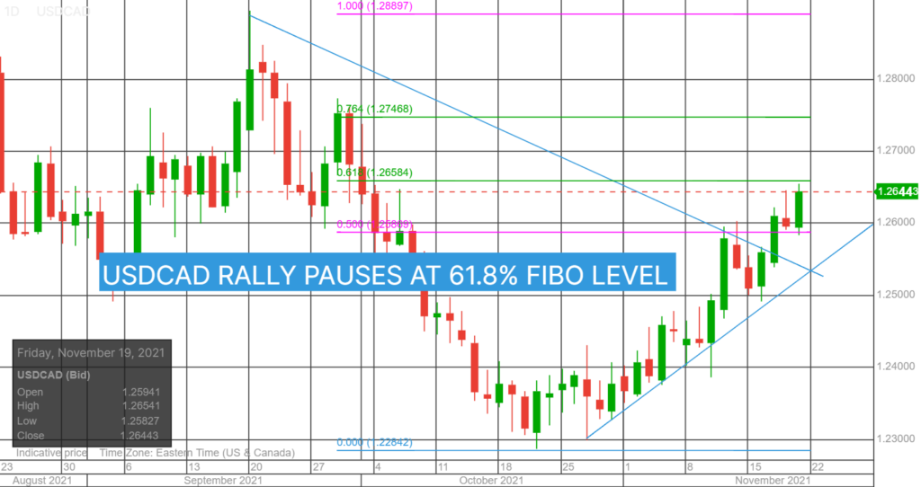 Technical view:  The USDCAD technicals are bullish. Prices have been grinding higher since posting a low of 1.2285 on October 25 but the rally stalled at 1.2654 overnight, just below the 61.8% Fibonacci retracement level of the September-October range which is in the 1.2660 area.  A topside break will extend gains to 1.2750, while a move below 1.2580 targets 1.2500.