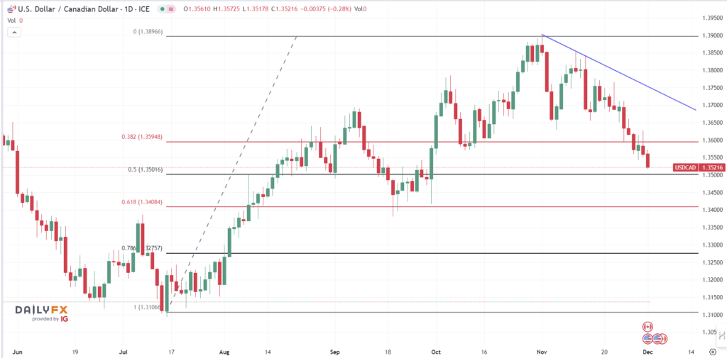 Fibonacci retracement analysis of the July-November move suggests the 50% retracement level of 1.3500 is support ahead of the 61.8% 13408 area.
