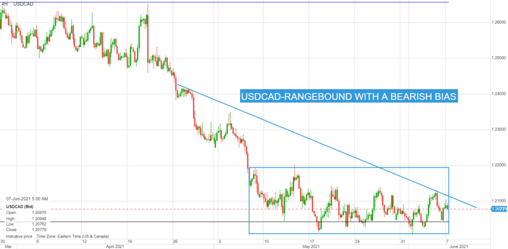 USDCAD snapped a nascent rally last week when prices climbed from 1.2030 June 2 to 1.2130 Friday before the Canadian and US employment reports. The Canadian jobs data missed forecasts, but it wasn’t a factor. Instead, prices reacted to the broad US dollar selling pressure due to the NFP data. The subsequent drop below 1.2110 turned the intraday technicals negative (again). USDCAD continues to be weighed down by the modestly hawkish BoC stance, in the face of a dovish Fed, and by rising commodity prices.